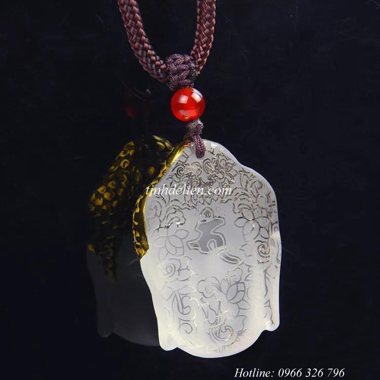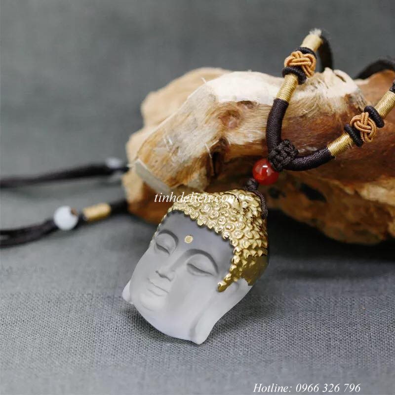 Mặt dây chuyền Đại Nhật Như Lai được làm từ Pha Lê Tự Nhiên tinh khiết và khảm vàng. Phía sau được in nổi 3D hình Hoa Sen Trắng Cát Tường và chủng tử của Phật Đại Nhật Như Lai.